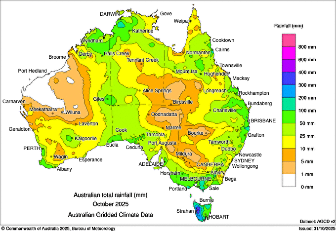 Rainfall patterns across Australia were highly variable and forecasts didn’t quite hit the mark for a lot of growers. Some regions scored a much-needed late moisture boost while leaving others to contend with an already dry finish. Eastern states fared best, particularly parts of Eastern NSW and VIC where several systems delivered regular top-ups. These falls helped stabilise later-sown wheat, barley and canola, and in some cases added valuable weight to grain still in the fill stage. Southwest VIC and pockets of Southeast SA experienced one of their wetter Octobers in recent years, which improved prospects after a challenging start.